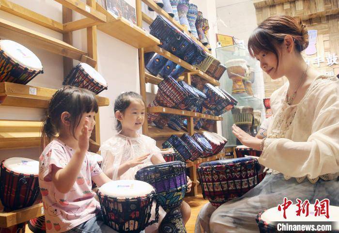 图为两位小朋友在丽江古城体验手鼓演奏。 黄兴鸿 摄
