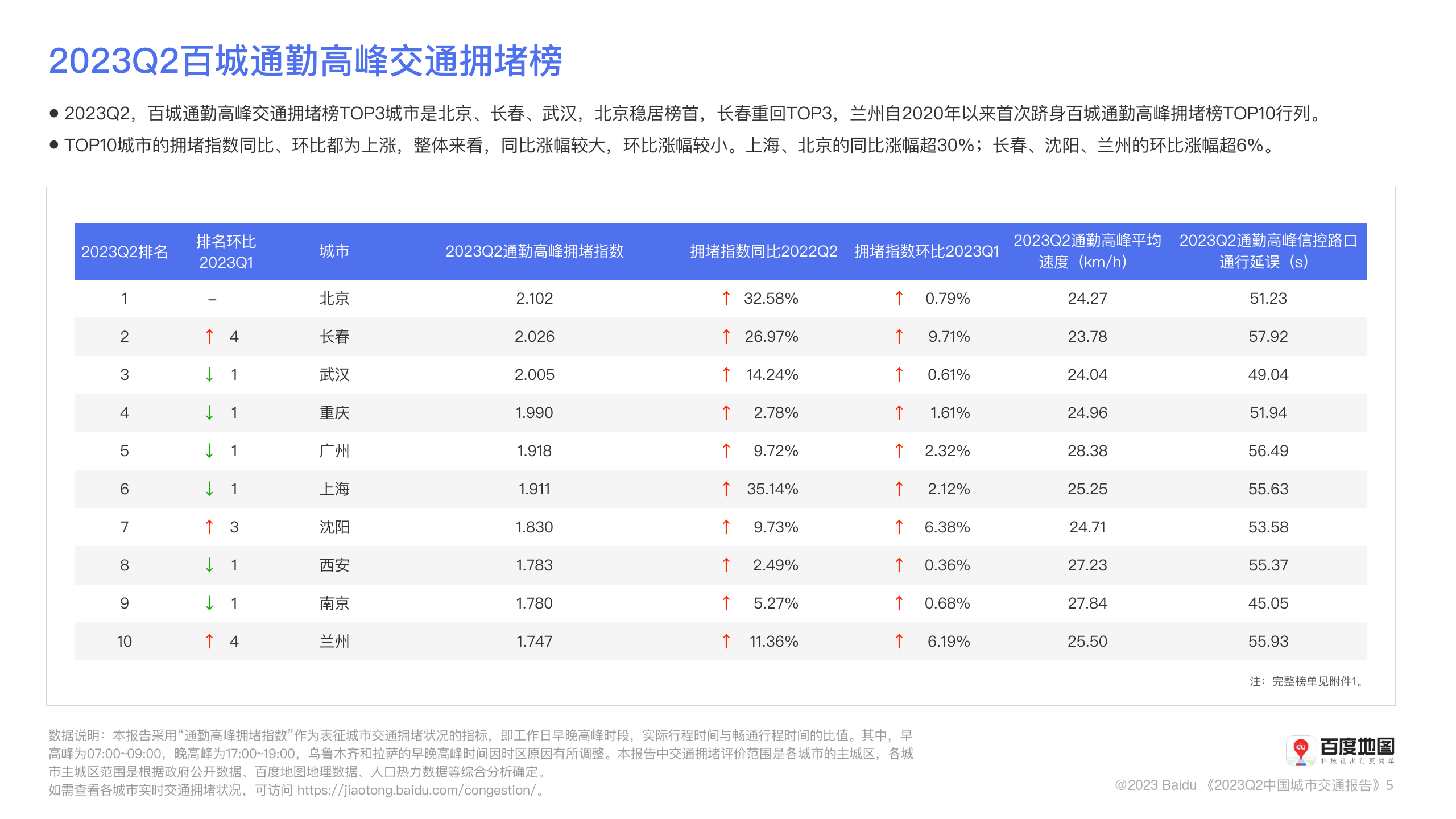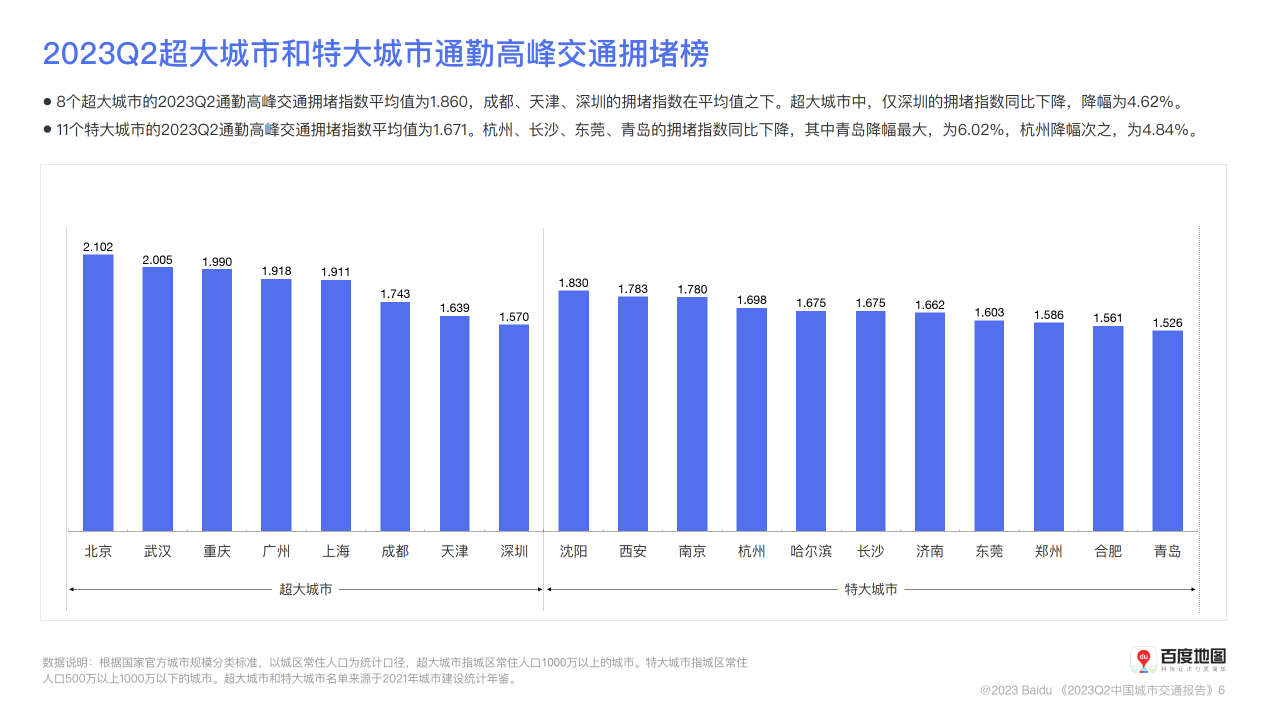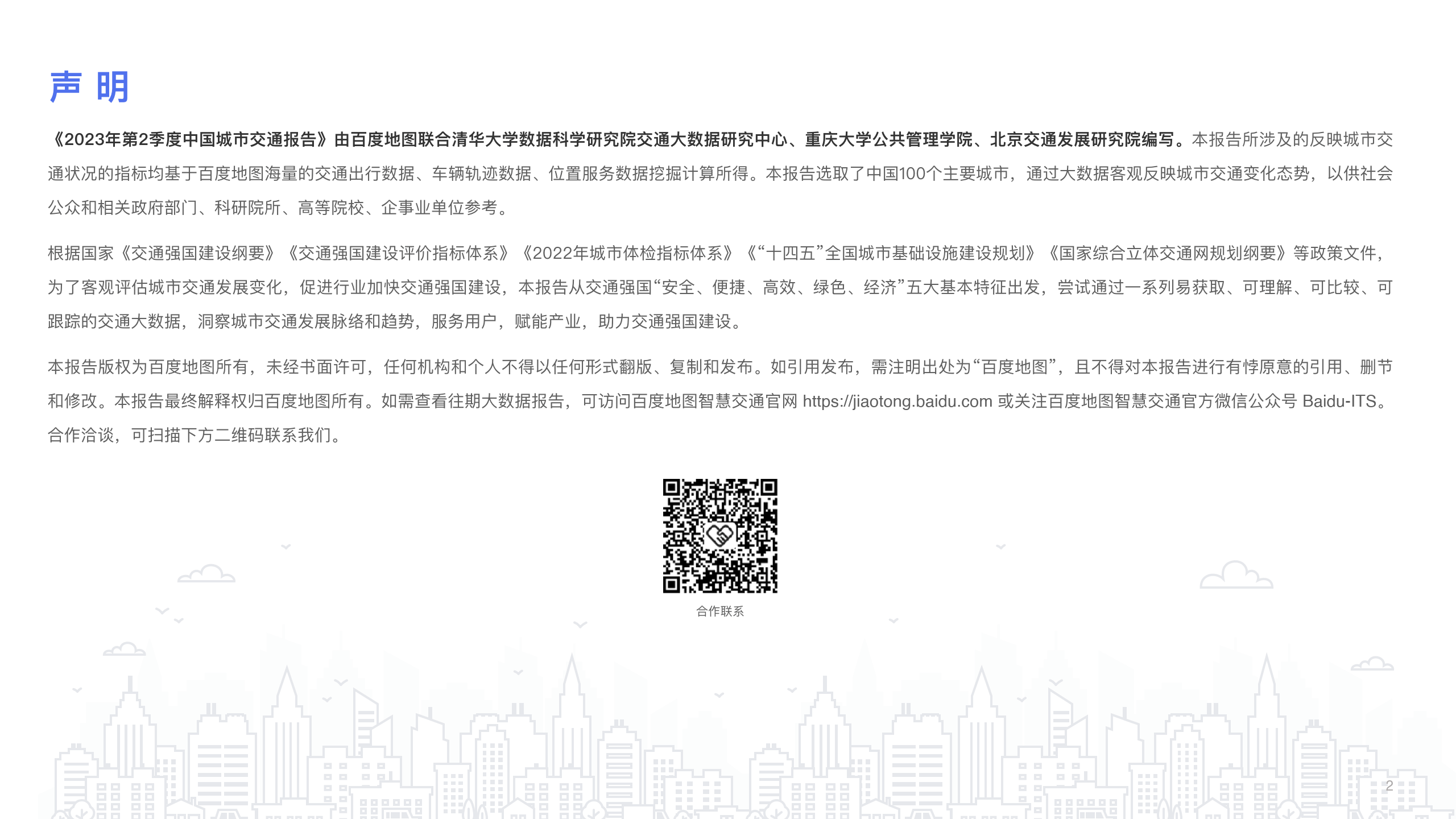 《2023年第2季度中国城市交通报告》由百度地图联合清华大学数据科学研究院交通大数据研究中心、北京交通发展研究院、重庆大学公共管理学院编写。本报告所涉及的反映城市交通状况的指标均基于百度地图海量的交通出行数据、车辆轨迹数据、位置服务数据挖掘计算所得。