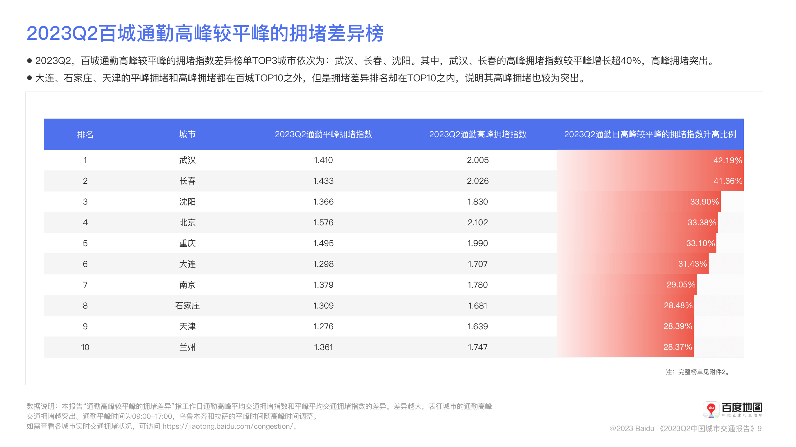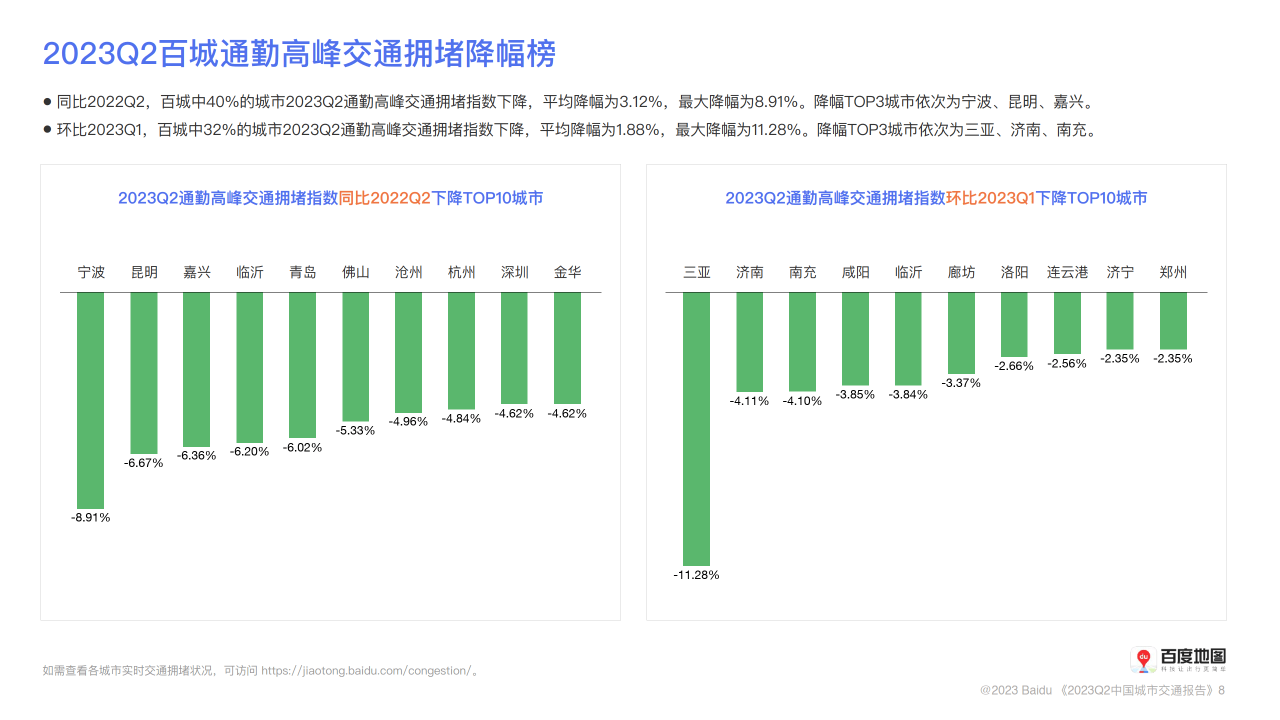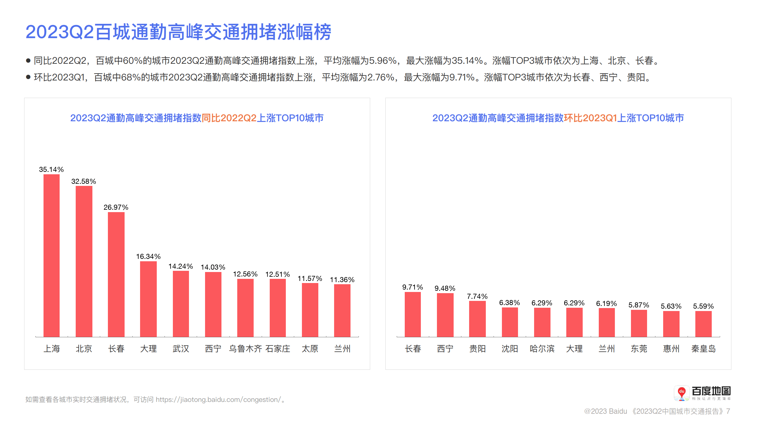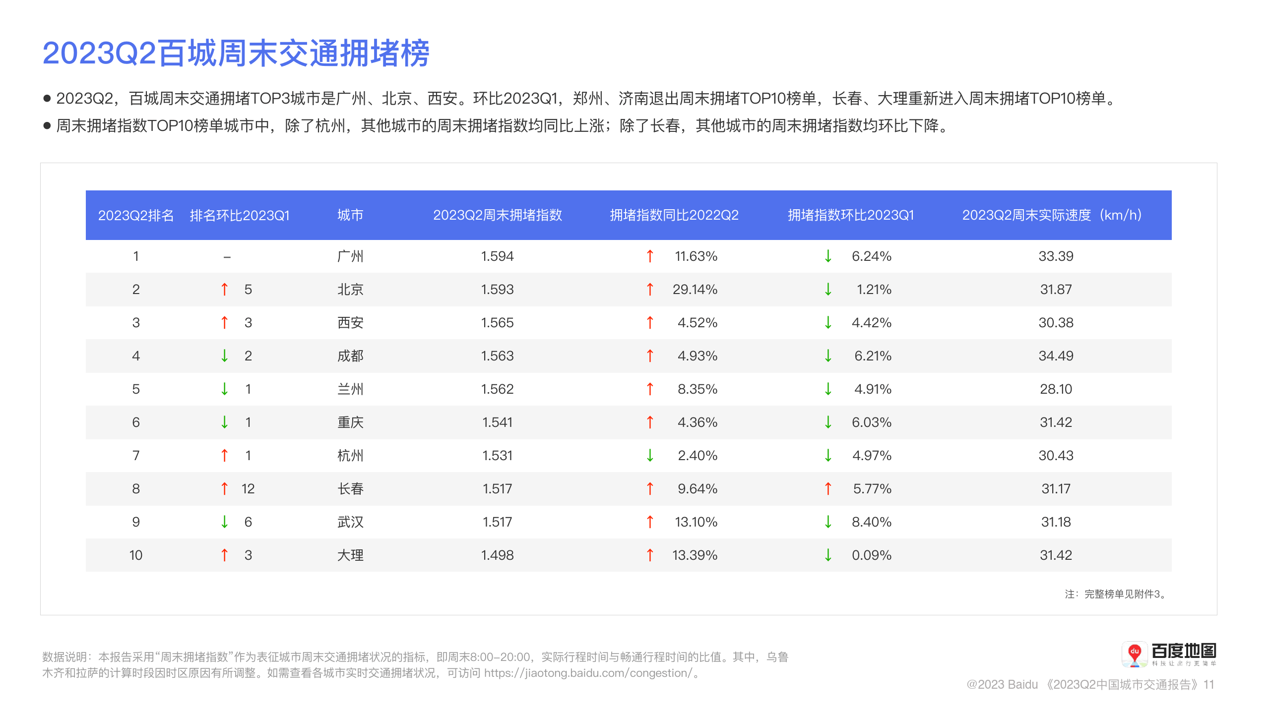 《2023年第2季度中国城市交通报告》由百度地图联合清华大学数据科学研究院交通大数据研究中心、北京交通发展研究院、重庆大学公共管理学院编写。本报告所涉及的反映城市交通状况的指标均基于百度地图海量的交通出行数据、车辆轨迹数据、位置服务数据挖掘计算所得。