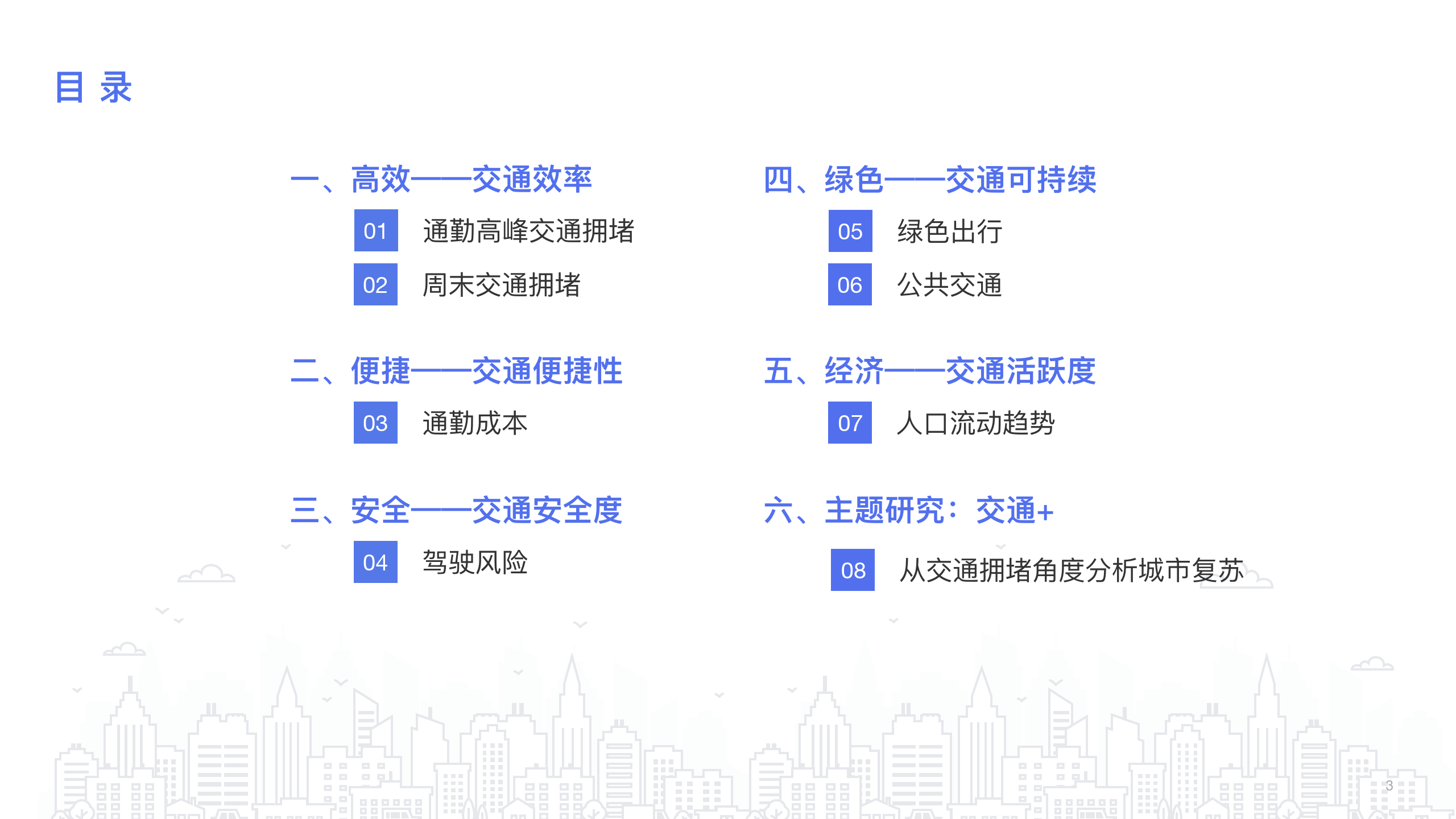 根据国家《交通强国建设纲要》《交通强国建设评价指标体系》《2022年城市体检指标体系》《“十四五”全国城市基础设施建设规划》《国家综合立体交通网规划纲要》等政策文件,为了客观评估城市交通发展变化,促进行业加快交通强国建设,本报告从交通强国“安全、便捷、高效、绿色、经济”五大基本特征出发,尝试通过一系列易获取、可理解、可比较、可跟踪的交通大数据,洞察城市交通发展脉络和趋势,服务用户,赋能产业,助力交通强国建设。