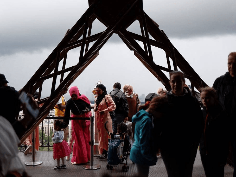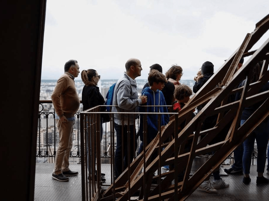 原标题:法国游客排队进入埃菲尔铁塔 眺望远方欣赏美景