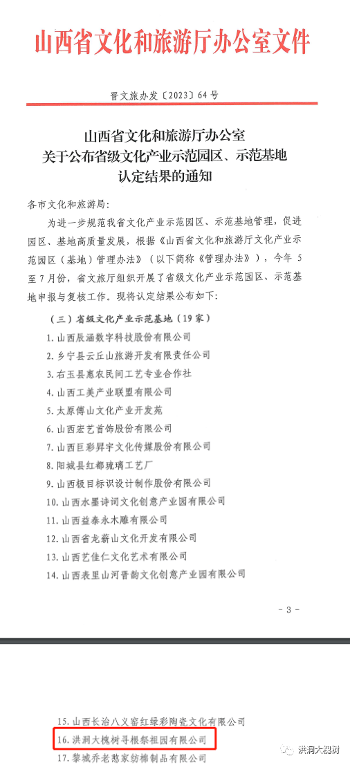 8月3日,山西省文化和旅游厅官网发布通知,公布省级文化产业示范园区、示范基地认定结果,洪洞大槐树寻根祭祖园有限公司获评“省级文化产业示范基地”。