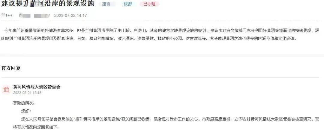 近日,有网友在人民网领导留言板留言,建议文旅部门提升黄河沿岸的景观设施。对此,兰州黄河风情线大景区管委会回复,目前,规划编制单位正在根据咨询意见修改完善。