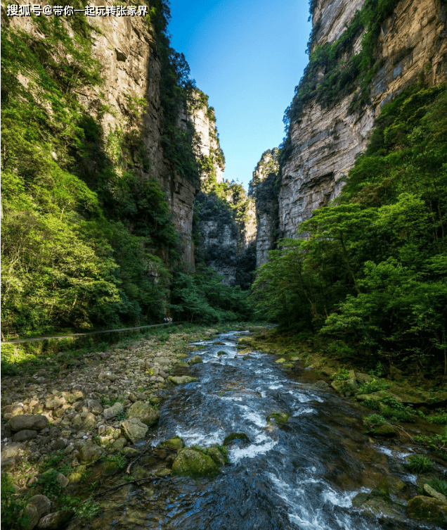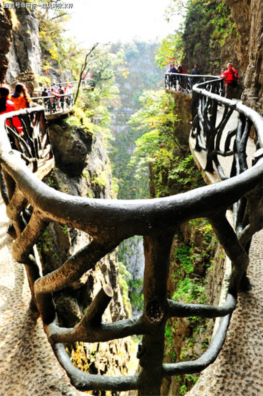 极目远眺,峰峦叠嶂,武陵千山万壑霎时奔向眼底,千姿百态的奇峰怪石,宛若一柄柄利刃齐刺蓝天,好一派“峡谷翻澜千柱抵”的壮丽景象!俯瞰清幽壑谷,云雾缭绕,一种“人在壁上走,云在脚下飘”的神奇感觉油然而生