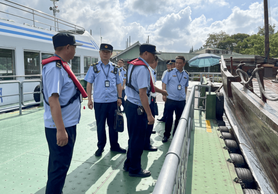 旅游旺季,做好景区“安全体检”格外重要。在鼋头渚景区游船码头,联合检查组重点检查了码头秩序管理、游客乘船安全提示、船舶安全设施配备、航行日志、应急救援等涉船涉水安全运营情况。
