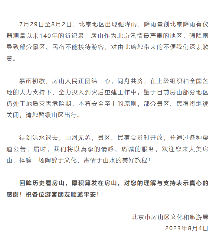 今天下午,北京市房山区文化和旅游局发布信息,房山是北京汛情最严重的地区,强降雨导致部分景区、民宿不能接待游客。鉴于目前房山部分地区仍处于地质灾害危险期,本着安全至上的原则,部分景区、民宿将继续关闭,请游客暂缓山区出行。