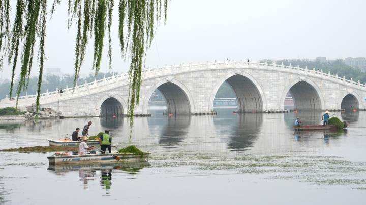 8月3日,北京玉渊潭公园,工作人员在进行水面清捞工作。据视觉中国