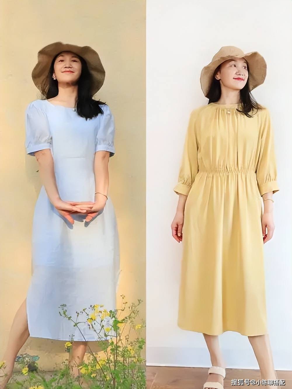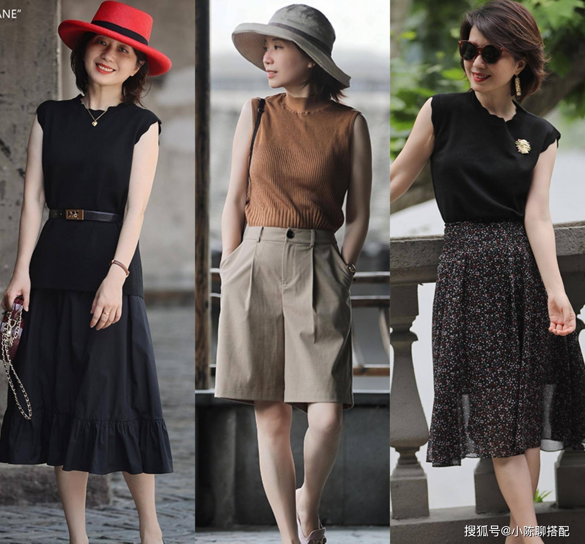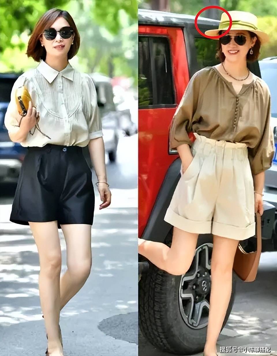 同样是短裤+纯棉上衣,遮住头,看上去都是有点法式清新的,但墨镜一安排上,立刻增加了一股英气,而右边因为多了个草编帽,最终风格又定格成了清新秀气,左边则应裤子与眼镜的色彩双重叠buff,酷感十足。