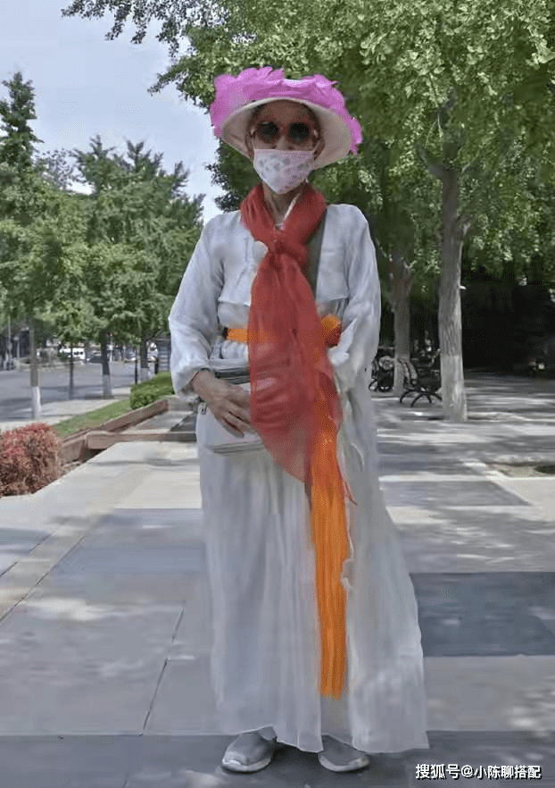 比如这位奶奶,所用的配件已经算是“大妈标配”,大红大绿的丝巾腰带+塑料感花帽子,简直就是在雷区蹦迪。但由于她的主件是飘逸轻盈的极简风,加上浮夸的点缀,两项对抗,反而有种把菜篓子带上秀场的的感觉,气度都升华了。