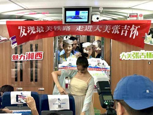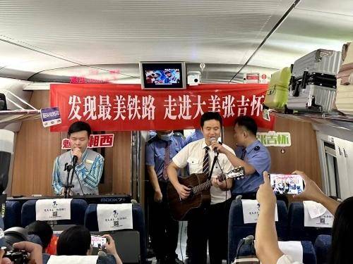 旅程中,列车长与餐饮乘务员合作弹唱原创歌曲《追梦的列车》,音律动人,声情并茂;快板节目《乘高铁看中国》节奏明快,一气呵成;民族舞蹈表演云袖翩翩,展现出湘西大美河山的魅力和民族韵味。