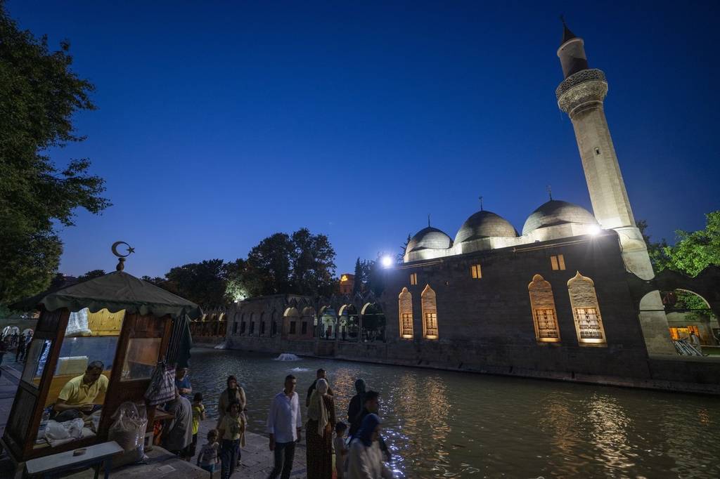 土耳其尚勒乌尔法,夜晚,民众参观古代遗址和传说中的“圣鱼池”(Balikligol)。