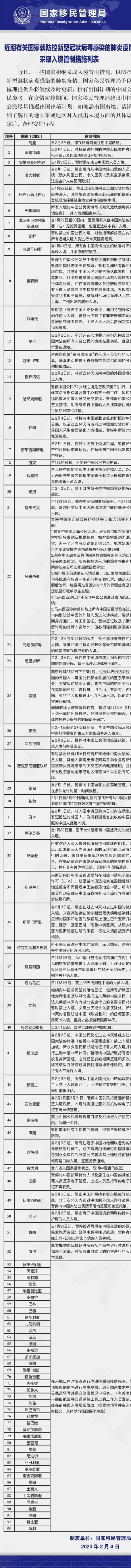 上面的表格是国家移民管理局今天(2020.2.4)梳理提供有关国家就防控新型冠状病毒感染的肺炎疫情采取入境管制措施列表。国家移民管理局建议中国公民尽量推迟出国出境计划,如确需出国出境,请详细了解目的地国家或地区对人员出入境方面的具体规定后,合理安排行程。