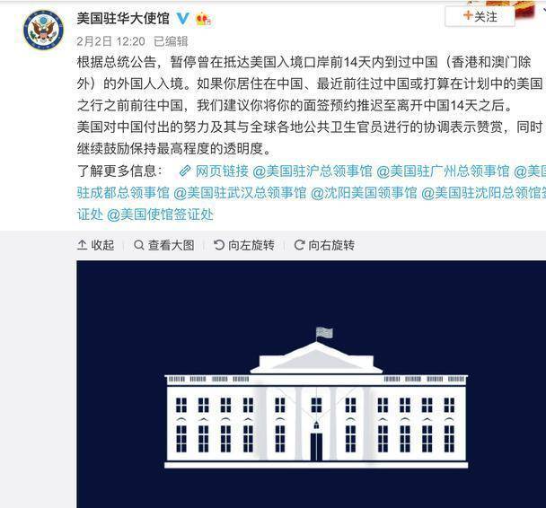美国:暂停曾在抵达美国入境口岸前14天内到过中国(香港和澳门除外)的外国人入境