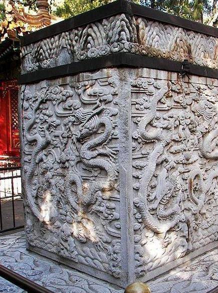 再者说的是在御花园里的钦安殿前的一块石头上,竟然刻满了和宫廷风格截然不同的水怪和海妖。相传是在嘉靖年间有次发生大火,是由真武大帝带着很多虾兵蟹将及时扑灭了大火,这才保住了钦安殿。
