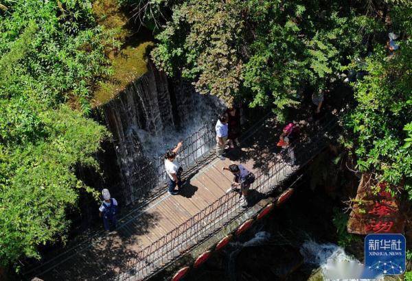 8月4日,游客在张家界市武陵源区宝峰湖景区游览(无人机照片)。