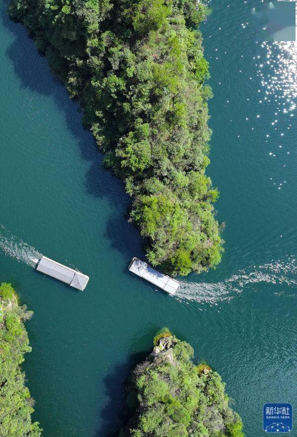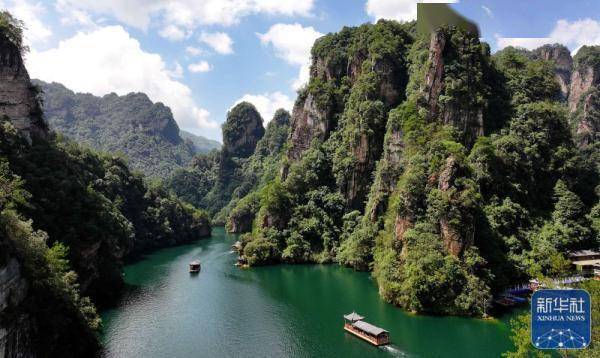 炎炎夏日,湖南张家界宝峰湖风景宜人,蓝天碧水间峰林映照,吸引众多游客前来游玩。