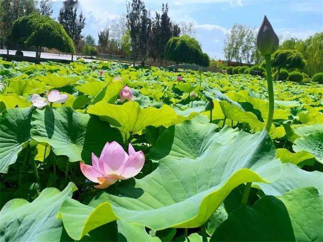 无论白天还是夜晚的荷塘,都美得令人心旷神怡,流连忘返。漫步放生池边,晨曦的露珠晶莹剔透,清新靓丽,如此一尘不染,仿佛从白塔圣殿里出来,然后含羞带怯地生长。粉荷用娇羞锁住柔情,那矫捷勇猛的蒙古铁骑是否也被这抹红温暖了沧桑的容颜。这个盛夏,期待在凉州会盟纪念馆“荷”你相遇。除了凉州会盟纪念馆,凉州植物园的荷花也很美很出片哦。茶余饭后、避暑纳凉、夏夜乘凉,这里都将是你不错的打卡地,一定不要错过。接天莲叶无穷碧,映日荷花别样红。夏日如果你不想远行,那就开启漫游凉州植物园荷塘吧,袅娜的荷花绽开笑脸,喜迎每一位游客。静静凝视一塘娇荷,便能在喧嚣的都市生活里,找寻到属于自己的宁静。