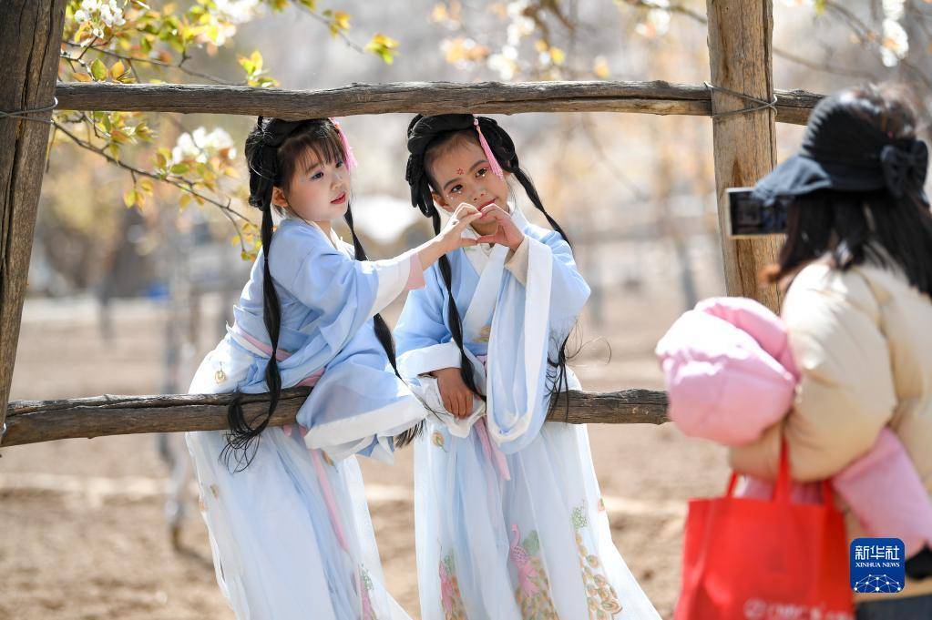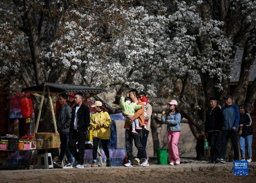 4月7日,家长带着孩子在南长滩村的梨树下留影。