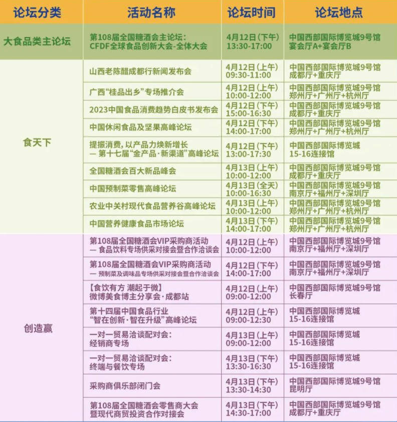 第108届全国糖酒商品交易会将于2023年4月12日-14日在成都举办,展馆分别位于中国西部国际博览城和世纪城新国际会展中心。