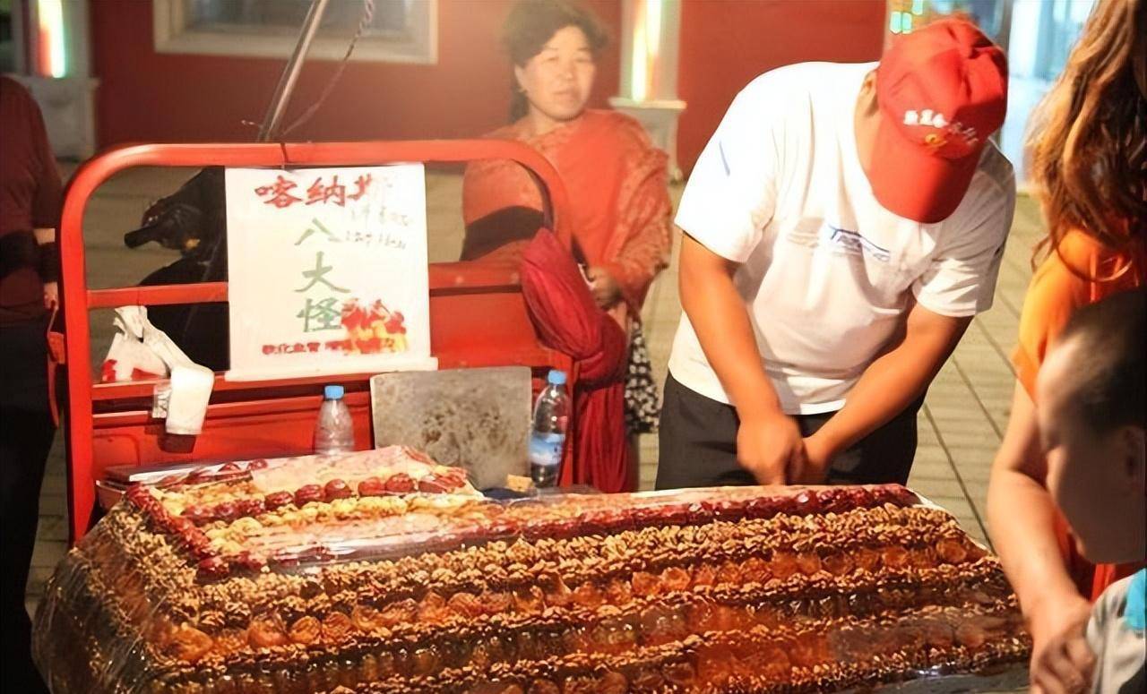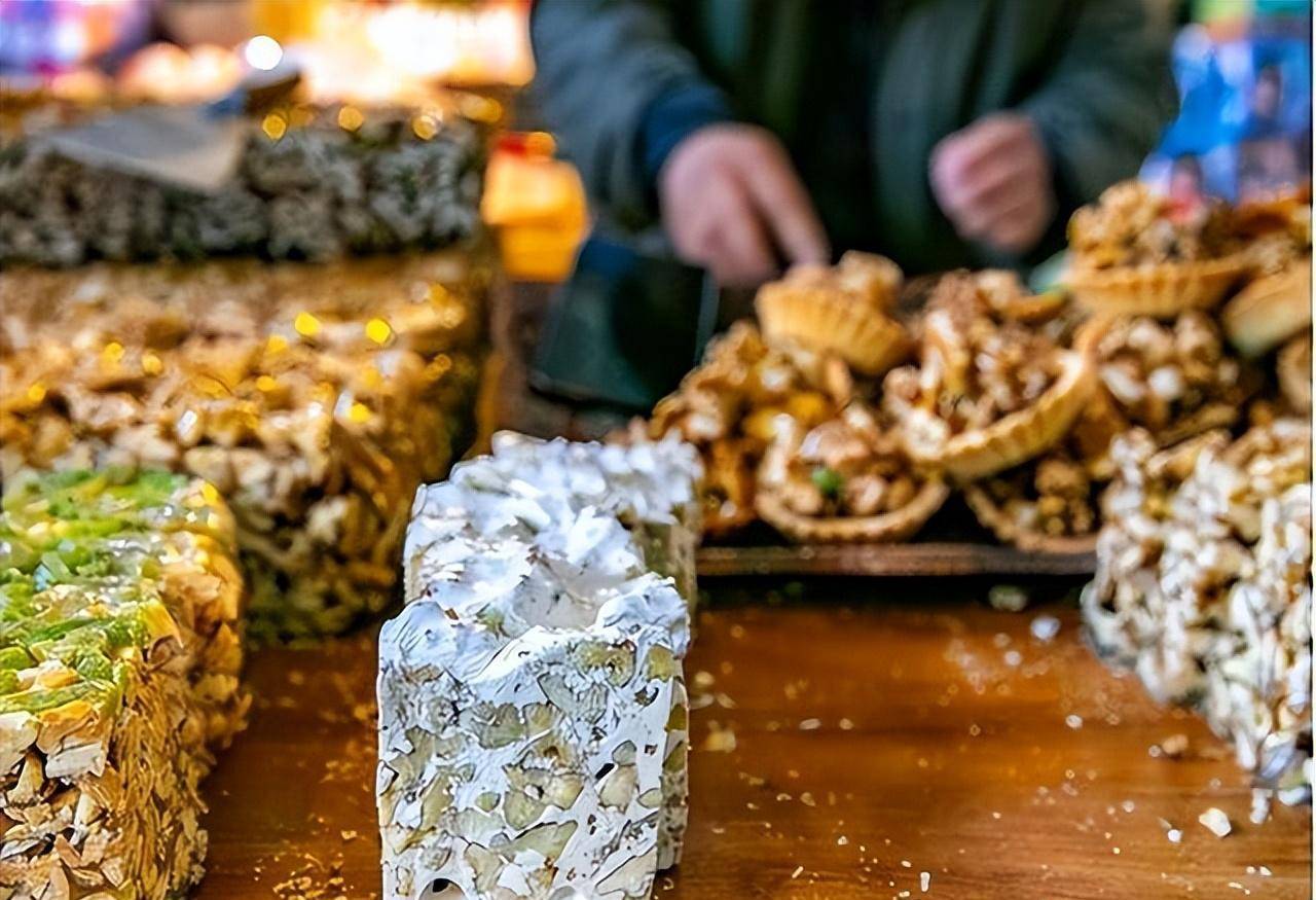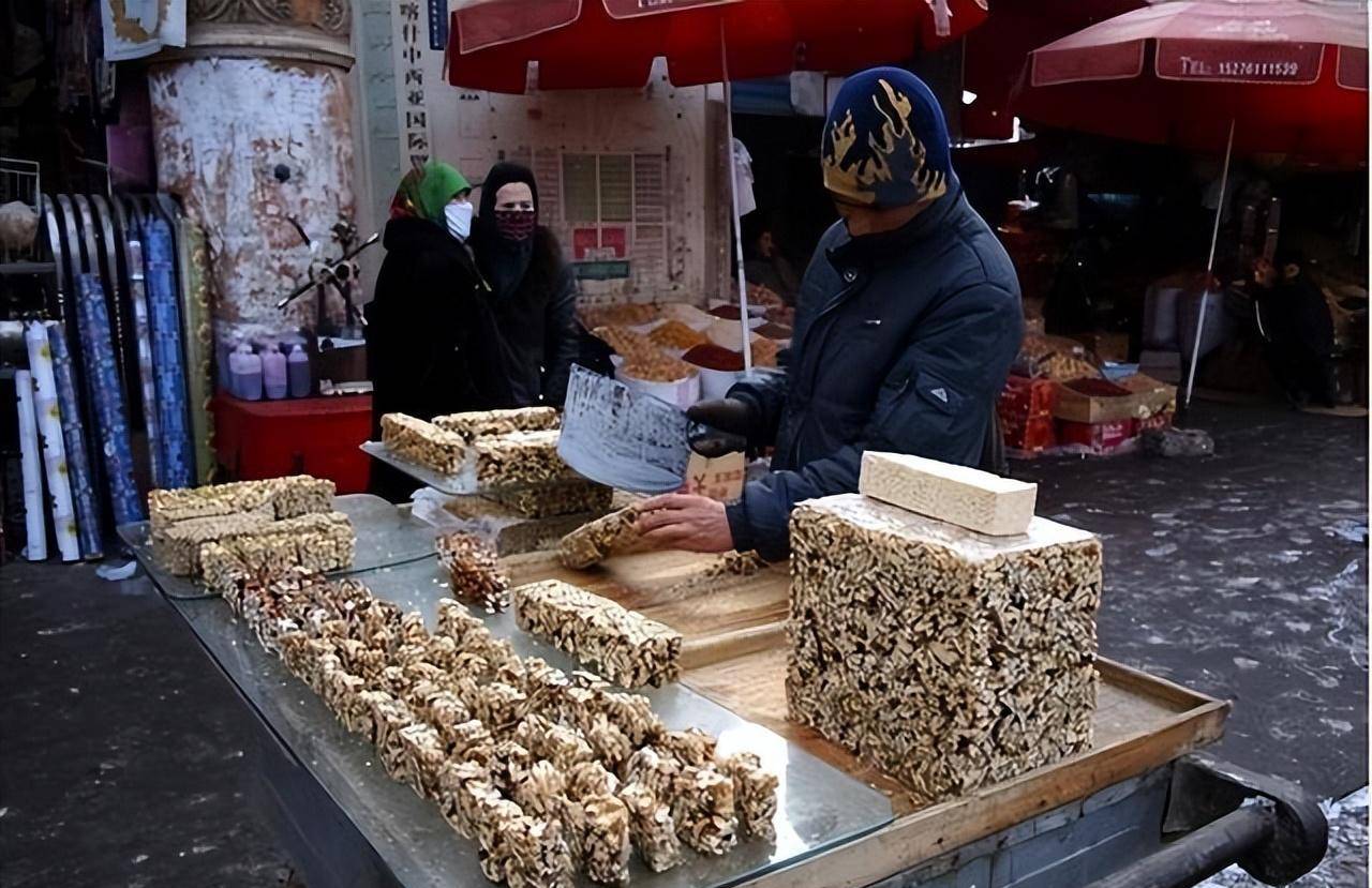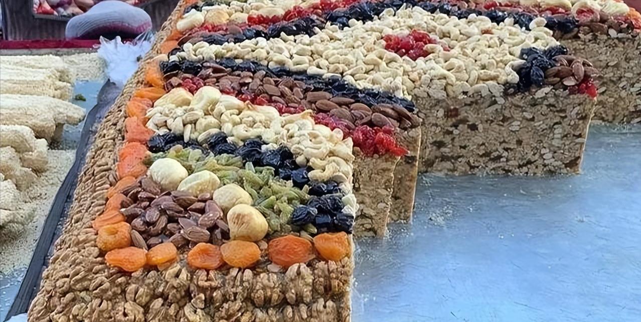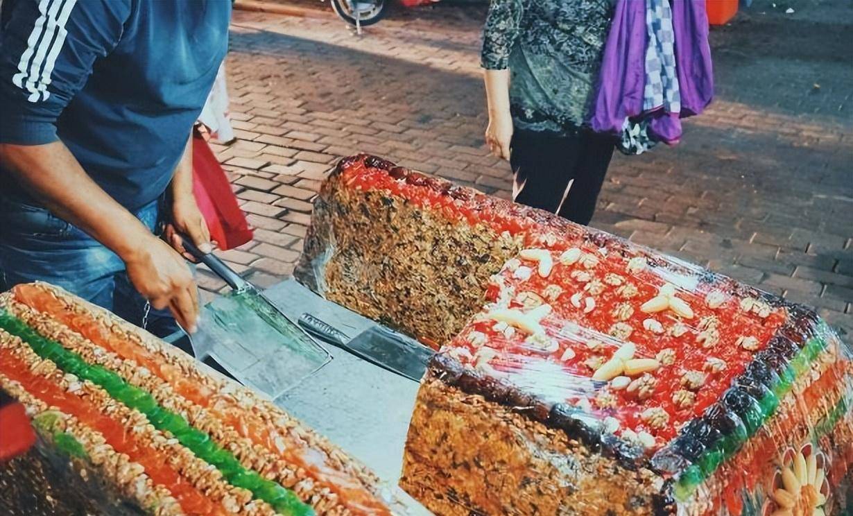 切糕在新疆被称作“玛仁糖”,是用各种坚果、果脯等材料熬制出来的,非常具有当地民族特色。最早作为丝绸之路商队的补给,由于便于携带且保质期长,为人们提供了大量的营养成分。