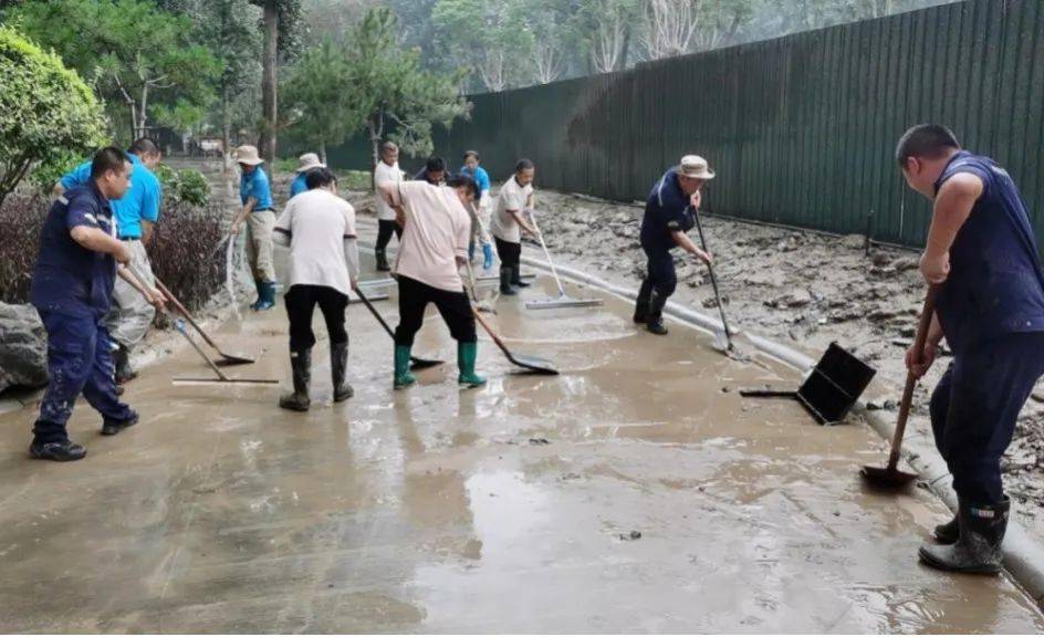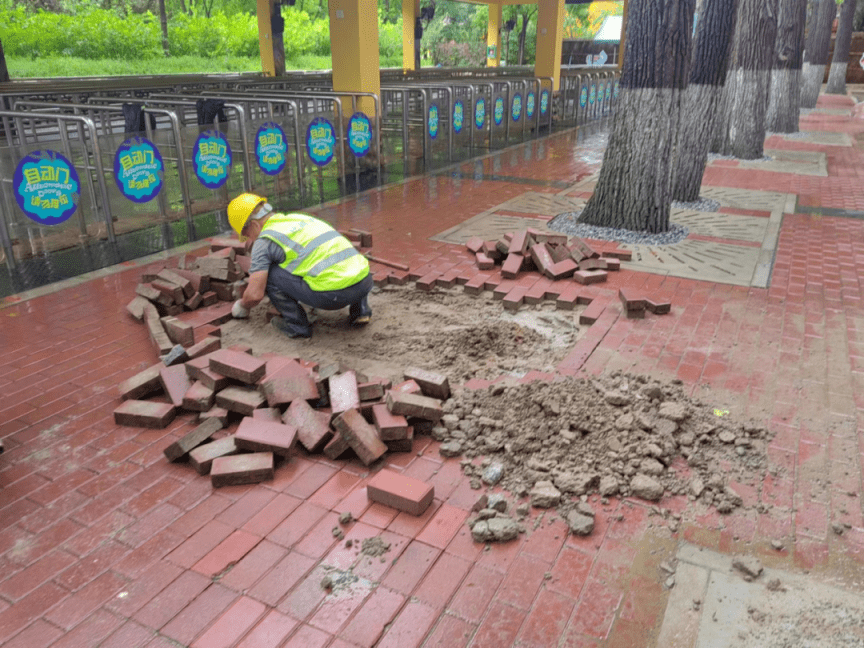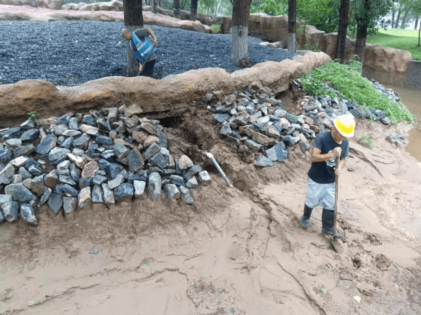 因连日来的暴雨,导致野生动物园景区多处路面塌陷,旅游基础设施损毁,形成安全隐患。为尽快恢复景区容貌,给游客提供一个舒适、整洁的游览环境,景区立刻安排施工人员奔赴现场维修,全力将灾后损失降到最小。