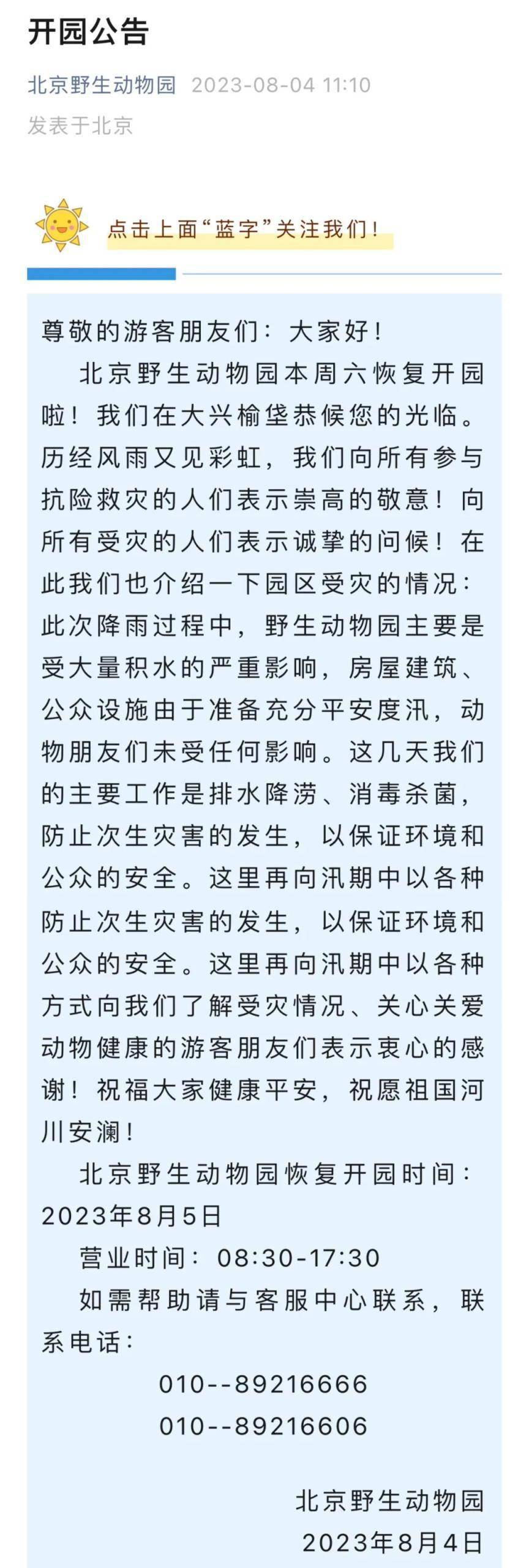 北京野生动物园开园公告