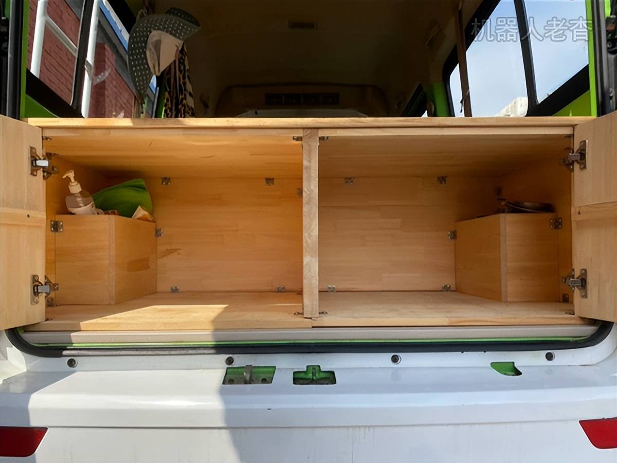 也可通过尾门进入车内,尾门上搭起雨布可作为临时淋浴间,解决洗澡问题。