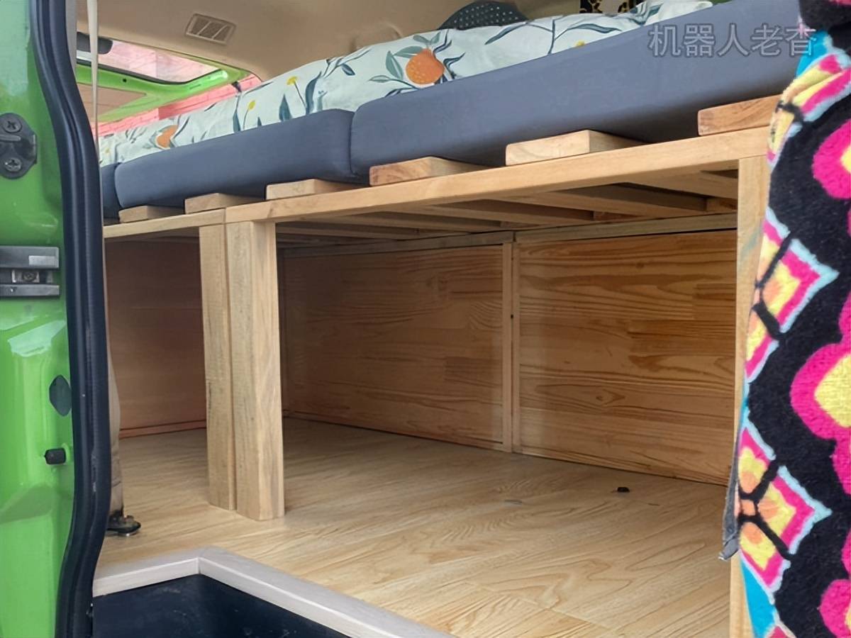改装部分前面设计成了一张桌台,地板换成了木质材料,用木箱组成了床位。