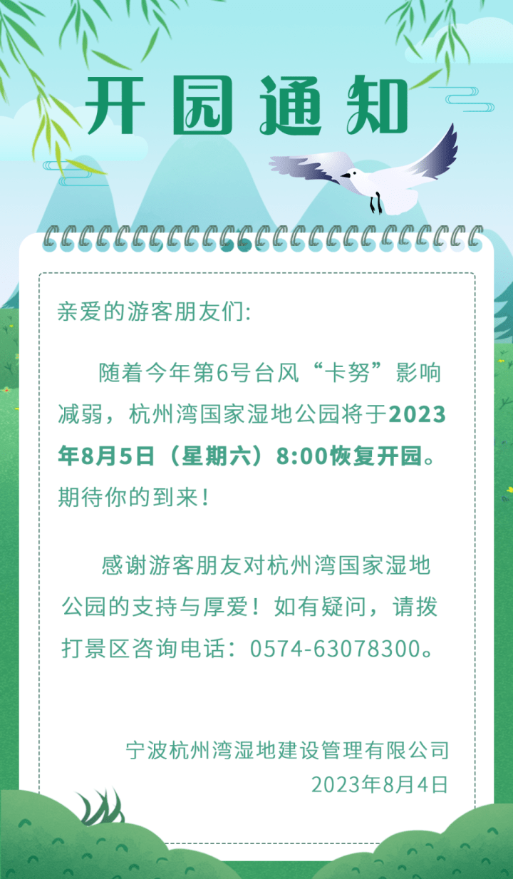8月5日起,奉化的徐凫岩景区,北仑九峰山旅游区、宁波梅山湾沙滩公园,杭州湾国家湿地公园,宁波市保国寺古建筑博物馆(景区)以及白云庄、天封塔、银台第景区等恢复对外开放。