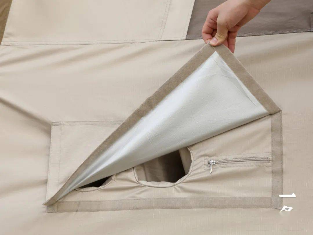 窗户用魔术贴固定,撕开后会露出一个小支撑杆,把窗户撑起来,增加帐篷透气性。