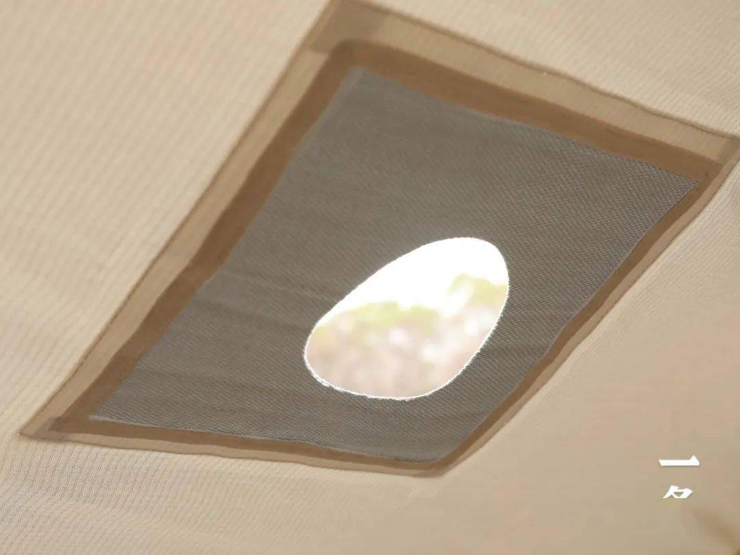帐篷一角还预留了户外空调的进气口、出气口和电源线拉链口,搭配露营用的户外空调,在炎热夏天也能安然休息。