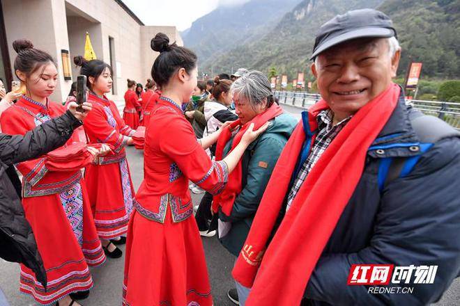 上午9点30分左右,景区举行了欢迎仪式,只见身着土家服饰的工作人员唱起了“土家拦门歌”,用最高礼仪热情迎接远道而来的客人,并为每位游客送上暖心礼物,现场欢声笑语不断。