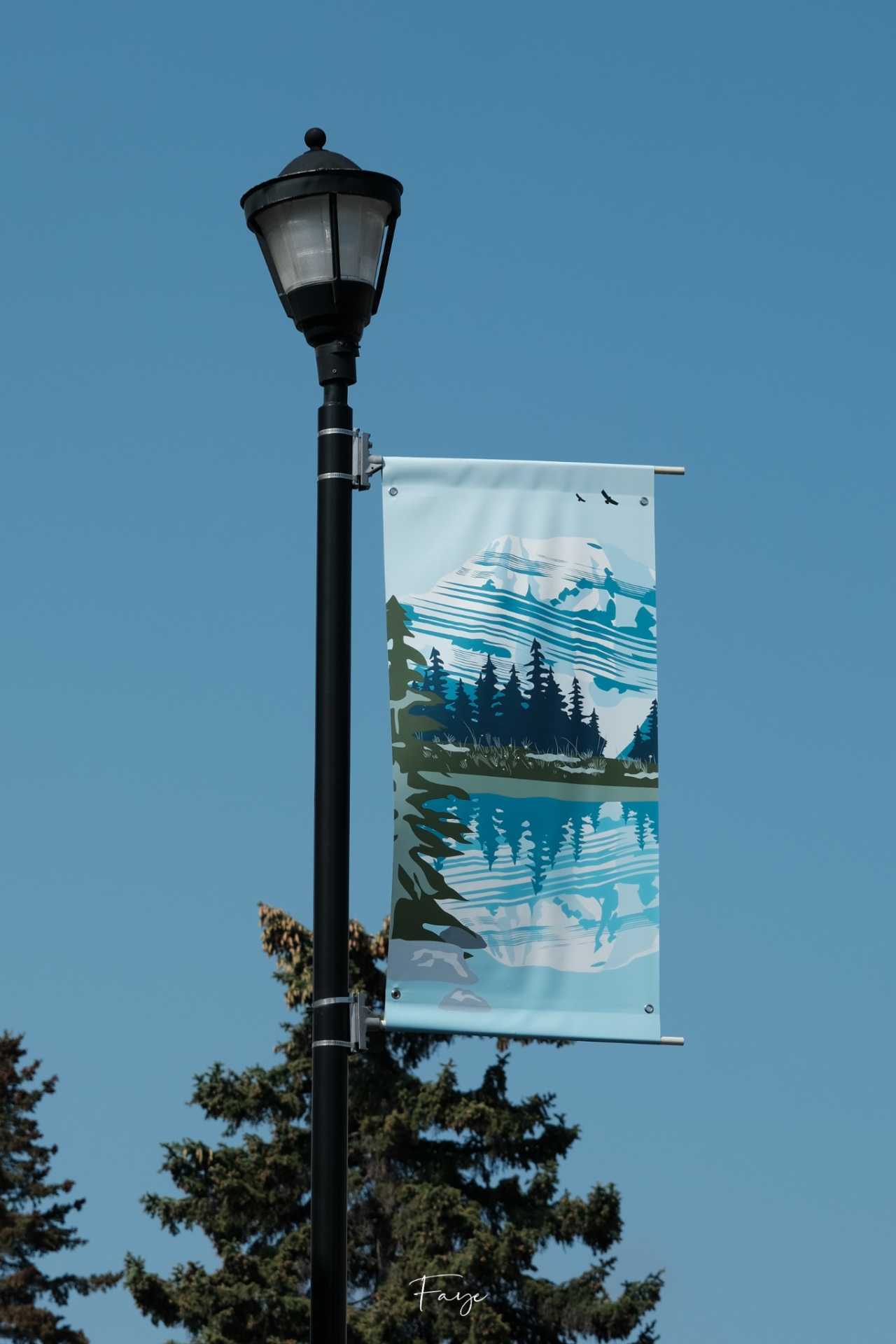 Jasper小镇的路灯上挂满了附近景色的卡通插画,这是关于Jasper小镇我最喜欢的点缀。除了雪山、湖泊之外,还有关于缆车、滑雪、划船等活动的插画,很有当地特色。