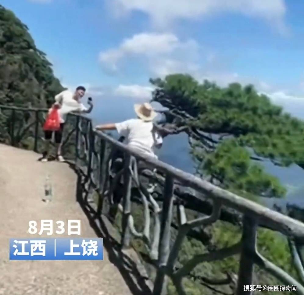8月3日,江西上饶三清山景区,一位老人为了展示自己的高难度美照,竟然异想天开,翻越景区护栏,坐迎客松上摆pose,跟这千年古树来一个亲密大合影。