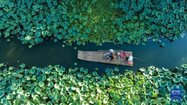 游客在黄山市徽州区呈坎古村乘竹筏游览(8月4日摄,无人机照片)。