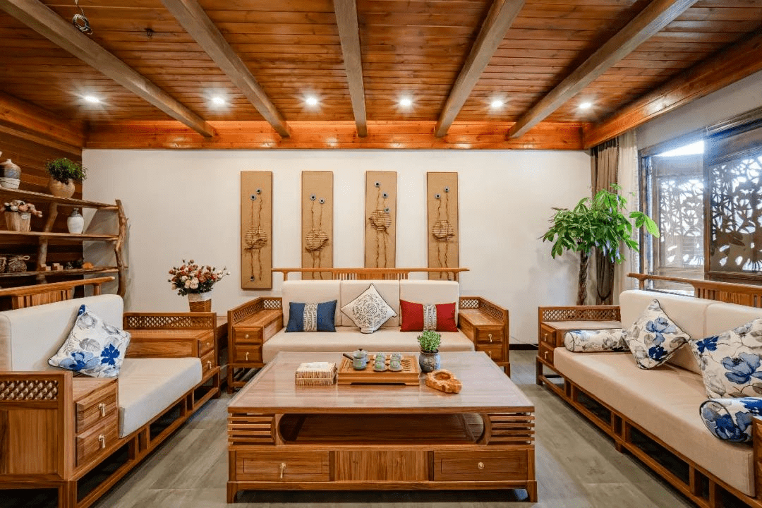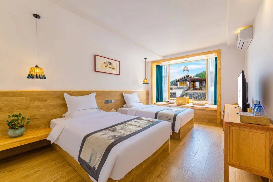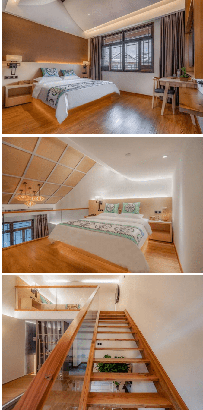 寻棠巷为禅意实木风格设计,客栈内摆满各式花草,多肉植物及精巧的小动物摆件,显得格外灵动有生机。