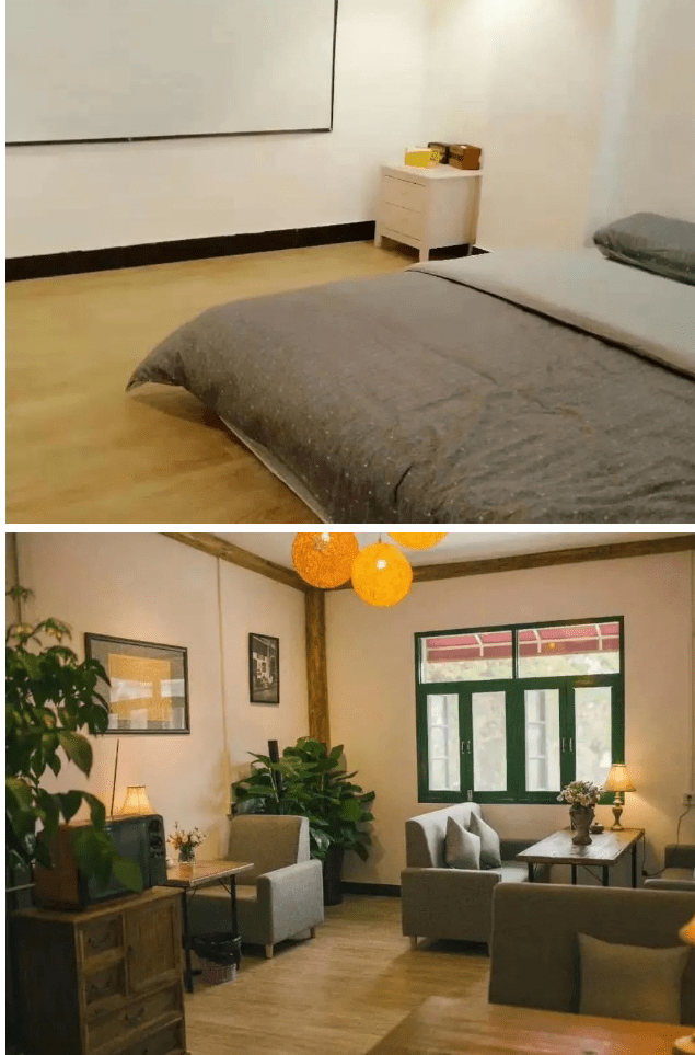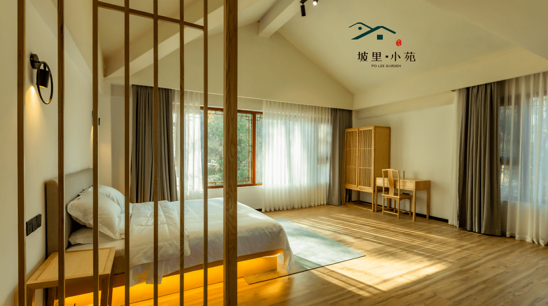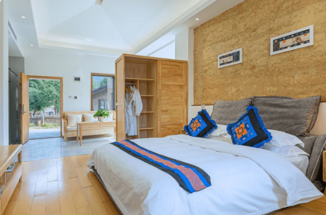 民宿共有14间客房,家具采用原木质自然风格,配以传统书画装饰,简约中带着古朴,浓浓的文化韵味。在布草与空间设计上,结合现代居住需求,做到舒适便利,客人来到竹俚别院,可以像回到家一样轻松自在。