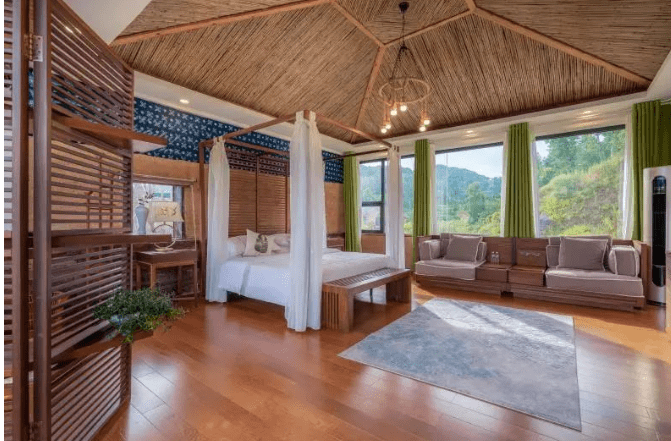 酒店建筑面积4600平方米,却只设计了13间客房,最小的客房面积50平方米,最大的套房面积达200余平方米。大面积的观景露台和落地窗,将窗外美景纳入其中,使房间内部与自然完美融合,足不出户,便可将翠绿山松尽收眼底。被评为2021年贵州特色民宿。