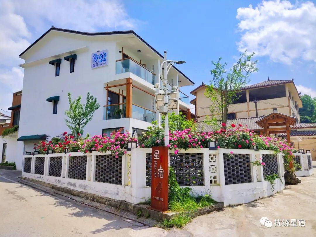 花溪星宿民宿就坐落于扰绕村,它入夜可见星空璀璨,醒来山巅云雾缭绕,温柔的日出和晚霞有一种让人住下就不想走的魔力。民宿的主体是一栋3层楼房,白墙青瓦,12间房以十二星座命名,装修风格根据每个星座不同的风格,使每一间客房都有其独特的设计和魅力。