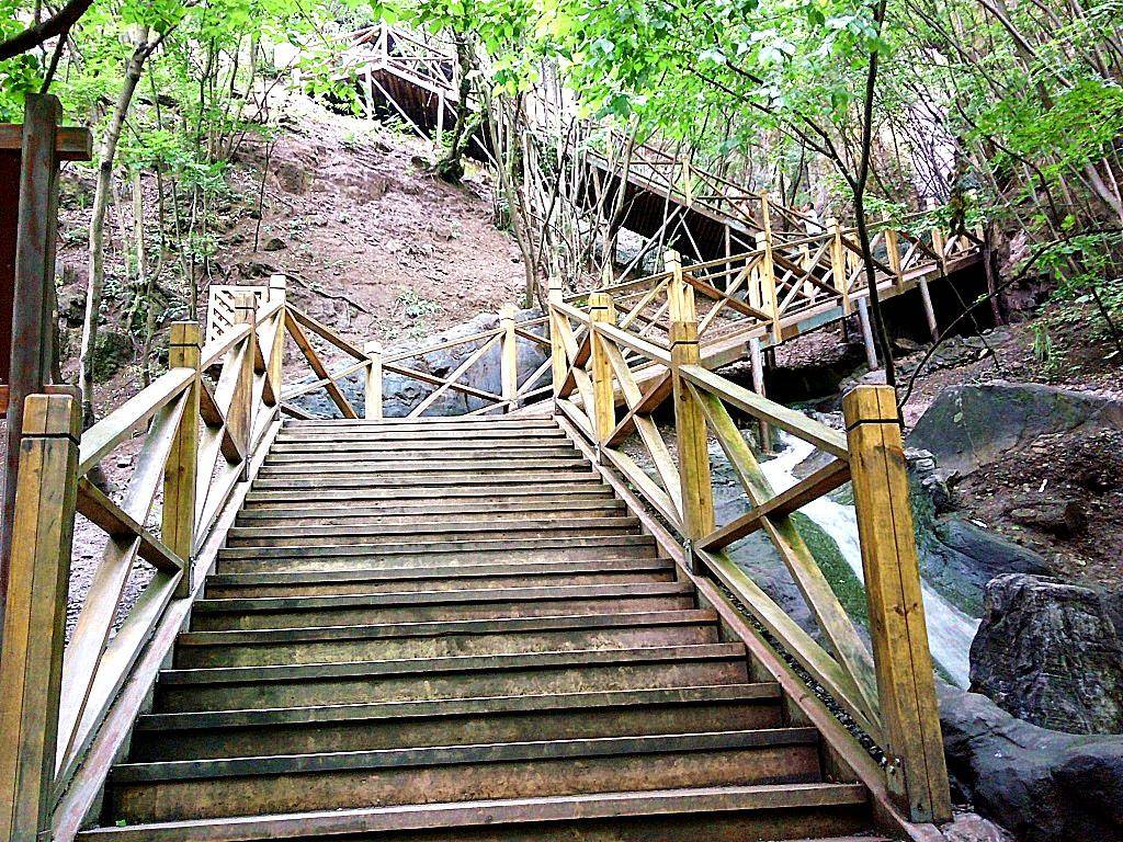 天梯栈道,全长1200米,高270米,由上下3000级台阶组成,蜿蜒曲折,构成了完整的循环游览线路。木质台阶上记录着公元前841年到公元2014年的历史纪年及重要历史事件,在锻炼身体的同时又能增长知识,健身益智,余味无穷。