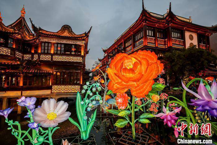 4月7日,“变装”后的豫园吸引如潮游客,大家一起观看霓裳花神翩跹而来。九曲桥畔,游客争相与花卉彩灯合影,“打卡”游园新景。
