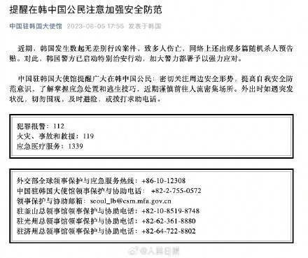 近期,韩国发生数起无差别行凶案件,致多人伤亡,网络上还出现多篇随机杀人预告贴。对此,韩国警方已启动特别治安行动,加大警力部署予以强力应对。中国驻韩国大使馆提醒广大在韩中国公民:密切关注周边安全形势,提高自我安全防范意识,了解掌握应急处置和逃生技巧,近期谨慎前往人流密集场所。外出时如遇突发状况,切勿围观,及时避险,或拨打求助电话。