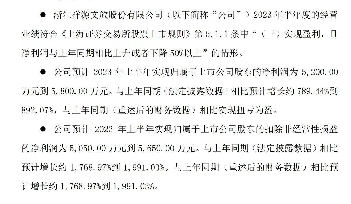 根据祥源文旅2023年上半年业绩预告披露,报告期内预计实现归属于上市公司股东的净利润为5200万元到5800.00万元。与上年同期(法定披露数据)相比预计增长约 789.44%到892.07%,与上年同期(重述后的财务数据)相比实现扭亏为盈;旗下上半年旅游板块游客接待量、营业收入和利润总额均出现显著增长。