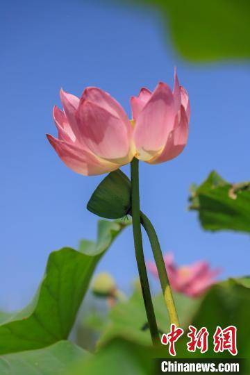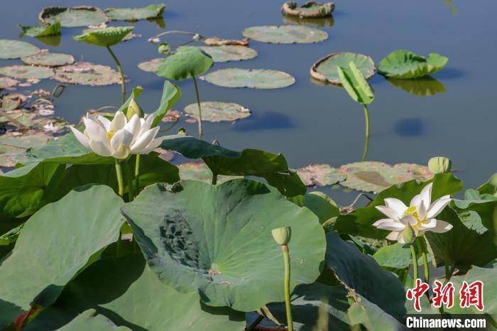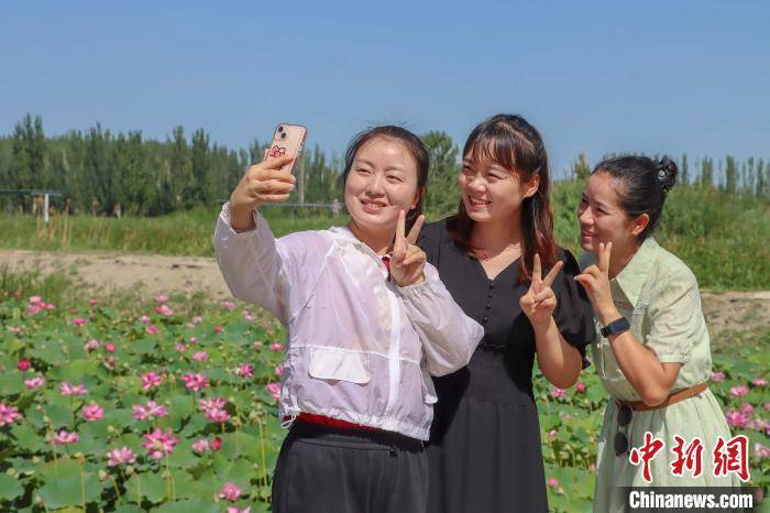 在博湖县荷花观赏园,蓝色的天空、翠绿的湖水,放眼望去,一朵朵娇嫩欲滴的荷花立于盈盈碧水间,或洁白如玉、或嫣红带羞,妩媚动人,呈现出“接天莲叶无穷碧,映日荷花别样红”的夏日美景。