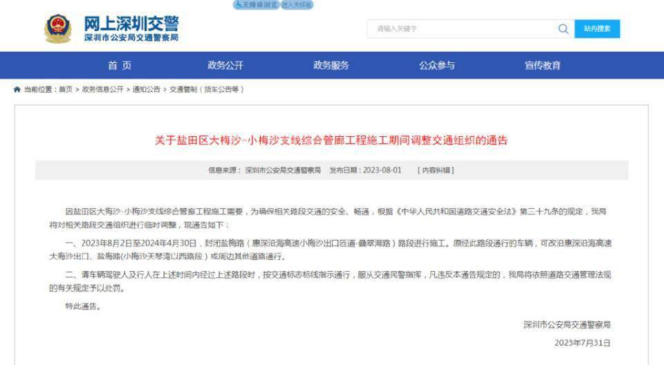 打算前往大小梅沙的朋友们,注意绕行!深圳交警发布通告,因盐田区大梅沙-小梅沙支线综合管廊工程施工需要,2023年8月2日至2024年4月30日封闭盐梅路路段进行施工(惠深沿海高速小梅沙出口匝道-叠翠湖路)。