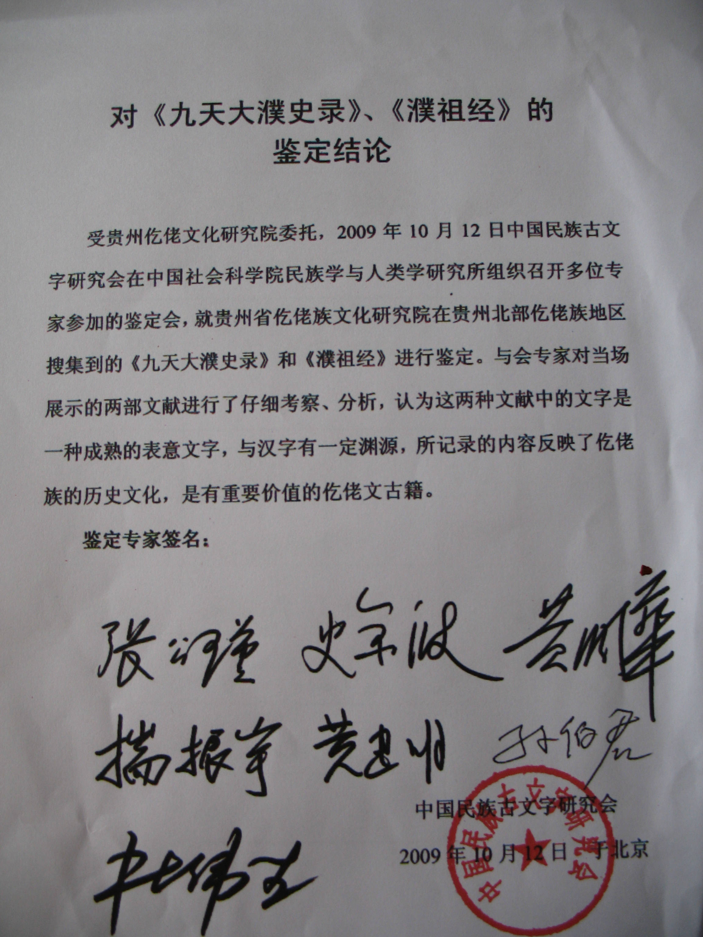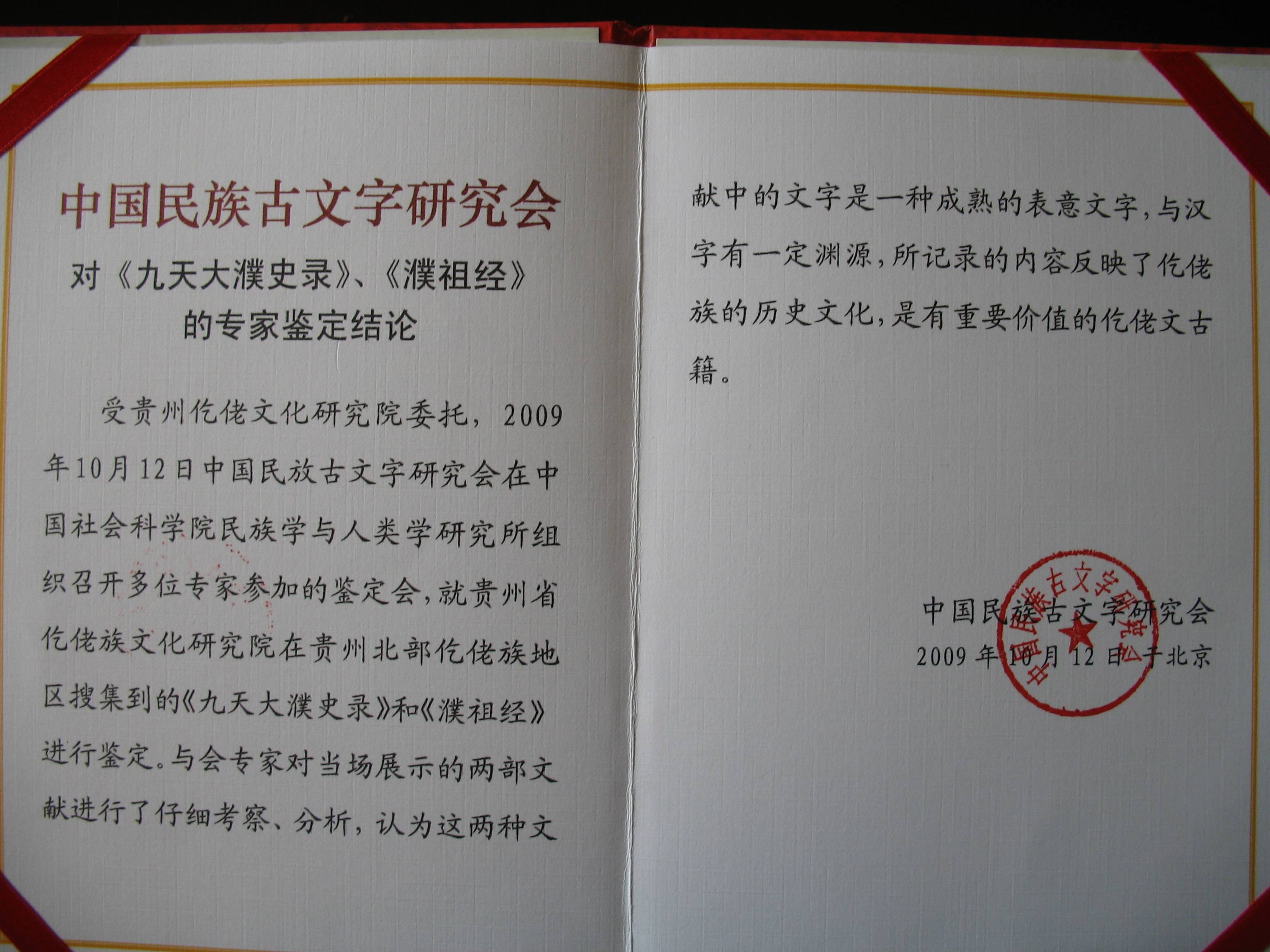 2009年10月12日中国民族古文字研究会对《九天大濮史录》《濮祖经》的专家鉴定结论