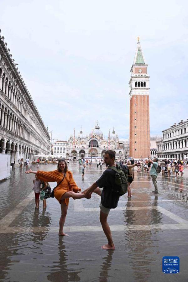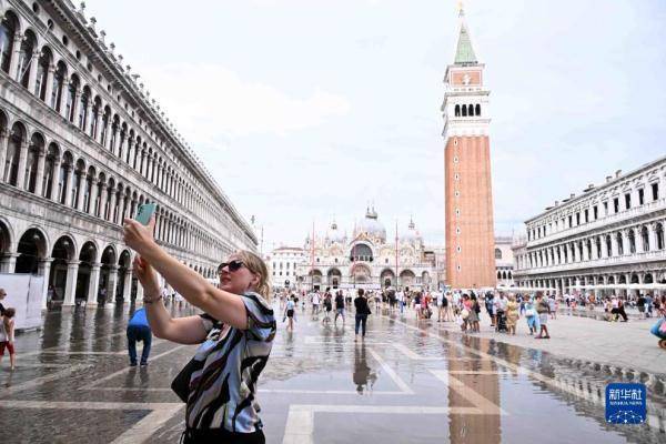 8月4日,一名游客在意大利威尼斯积水的圣马可广场自拍。