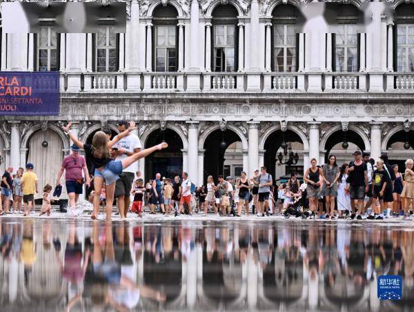8月4日,游客走在意大利威尼斯积水的道路上。