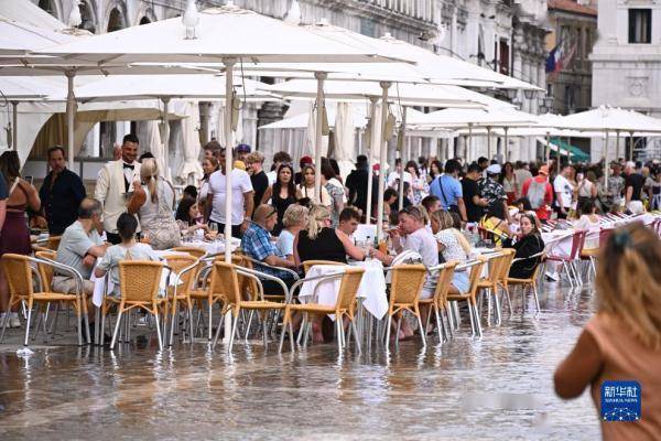 8月4日,游客聚集在意大利威尼斯积水的圣马可广场。