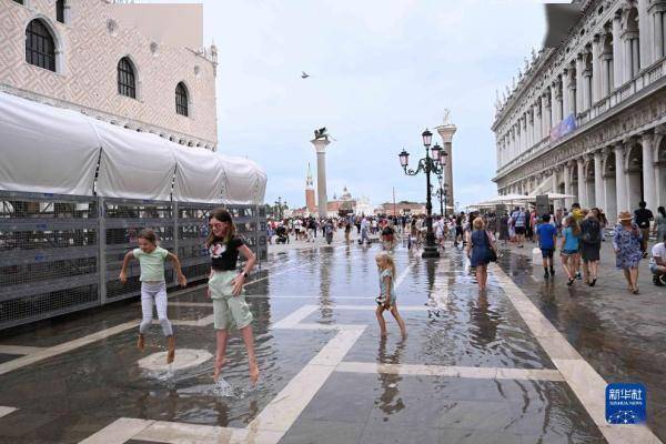 8月4日,在意大利威尼斯,几名儿童在积水中玩耍。